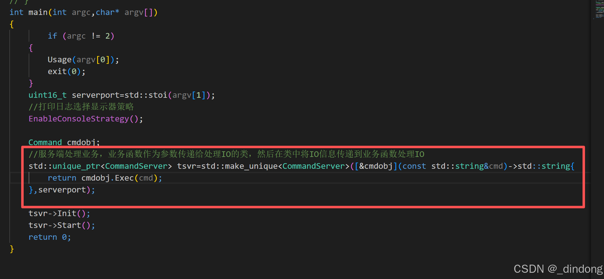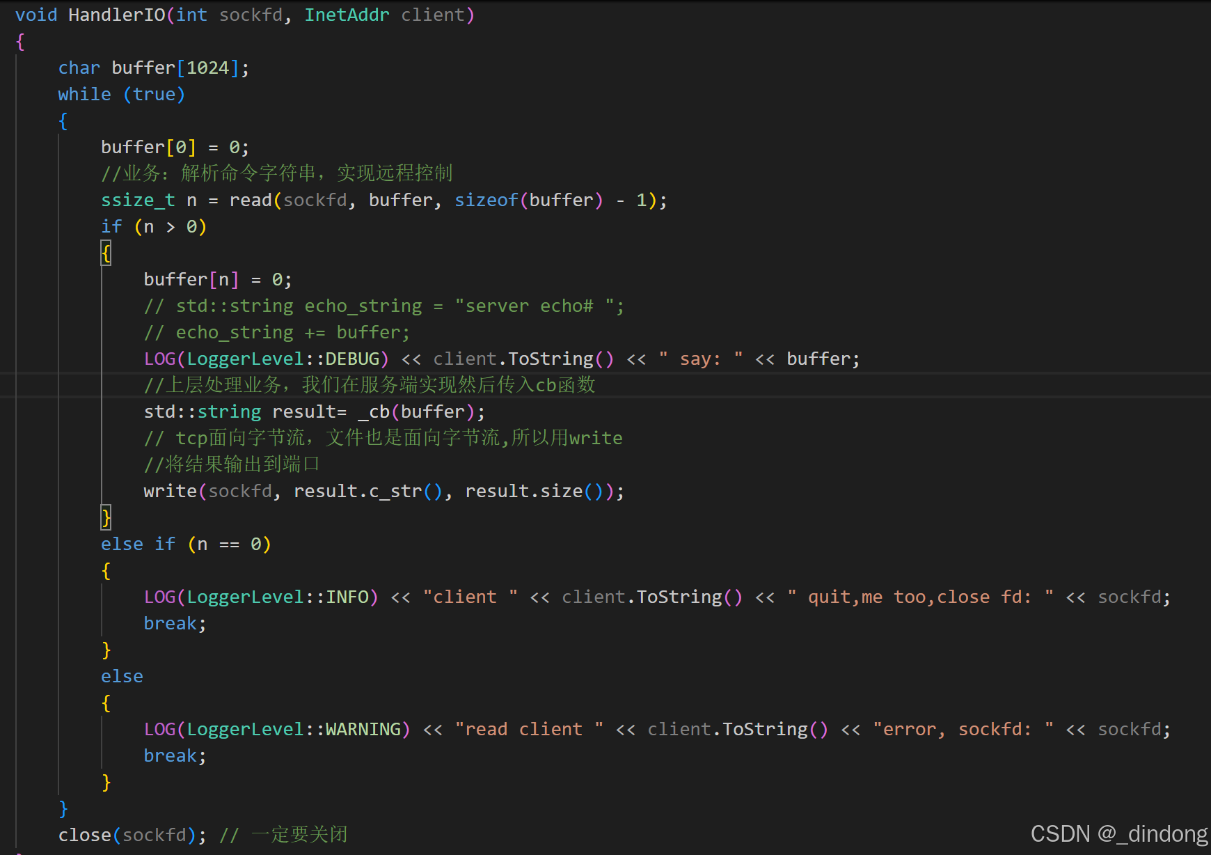 //服务端处理业务,业务函数作为参数传递给处理IO的类,然后在类中将IO信息传递到业务函数处理IO