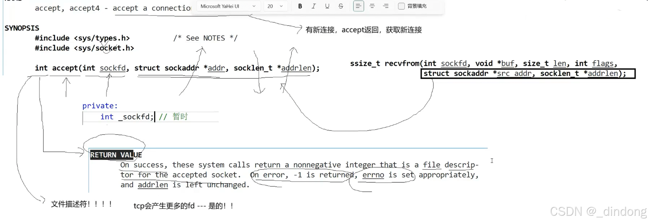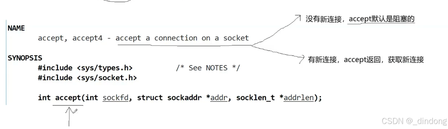调用accept函数获取连接时,是从监听套接字当中获取的。如果accept函数获取连接成功,此时会返回接收到的套接字对应的文件描述符。