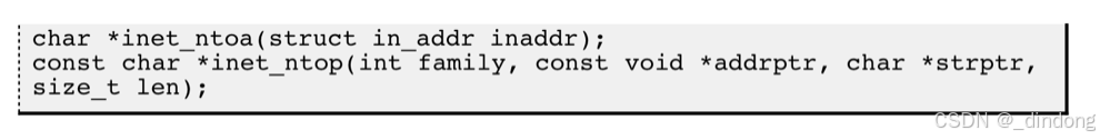 inet_pton和inet_ntop不仅可以转换IPv4的in_addr,还可以转换IPv6的in6_addr,因此函数接⼝是