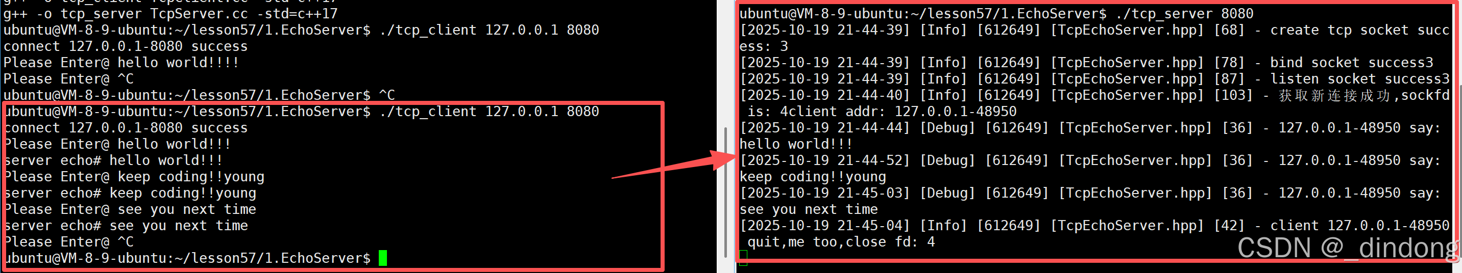 为了让通信双方都能看到对应的现象,我们这里就实现一个简单的回声TCP服务器,服务端在为客户端提供服务时就简单的将客户端发来的数据进行输出,并且将客户端发来的数据重新发回给客户端即可。当客户端拿到服务端的响应数据后再将该数据进行打印输出,此时就能确保服务端和客户端能够正常通信了。