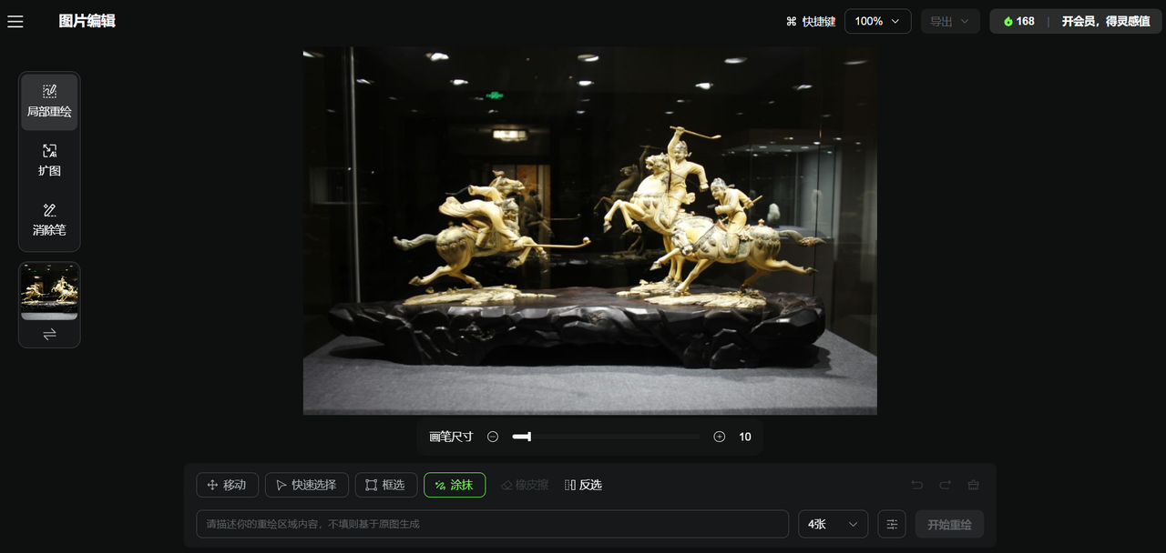 智能编辑:对生成的图片进行抠图、局部重绘、高清放大等后期处理。