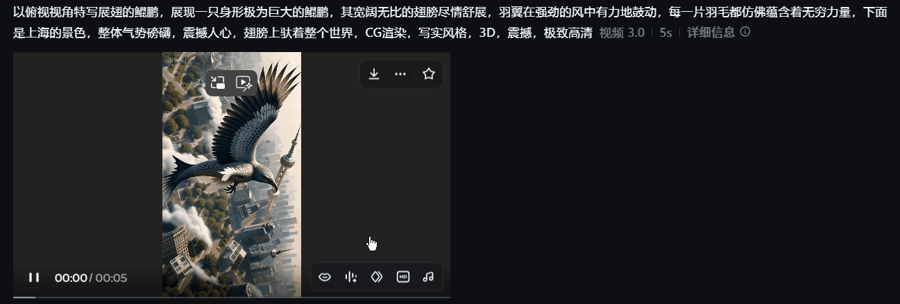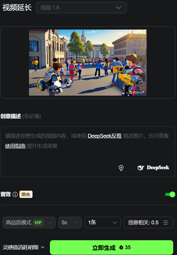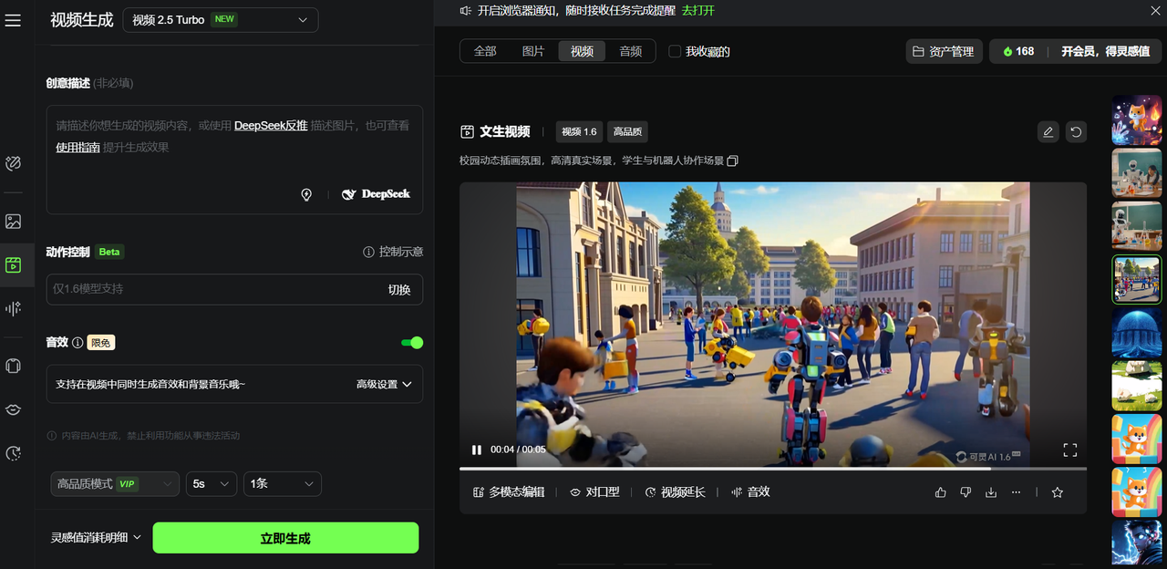 - **文生视频:**输入脚本或关键词(如"马拉松选手冲向终点"),自动生成连贯的动态视频,支持自定义运镜(平移、旋转)、运动速度和时长(4-30秒)。