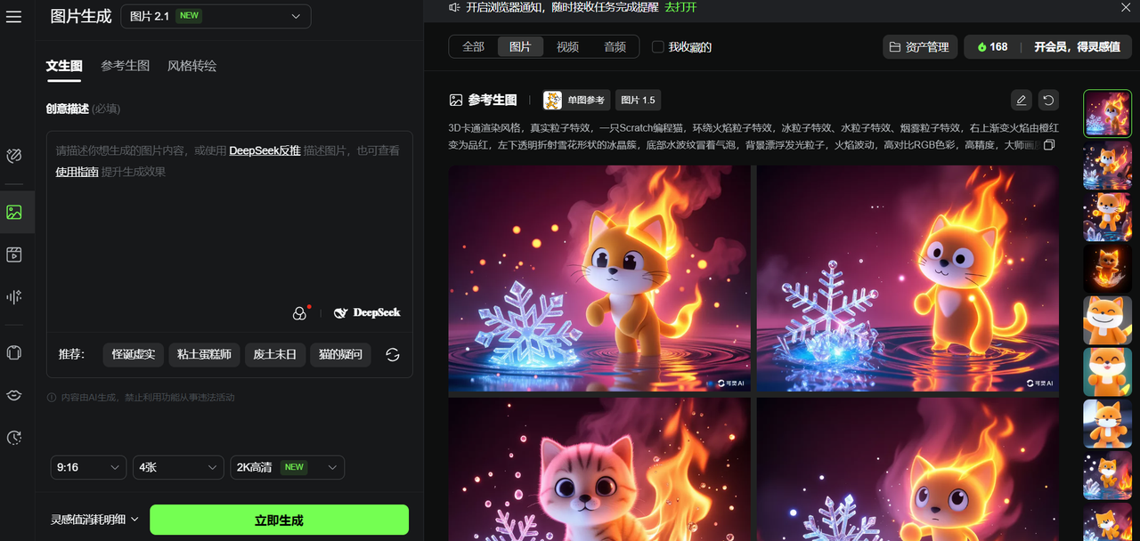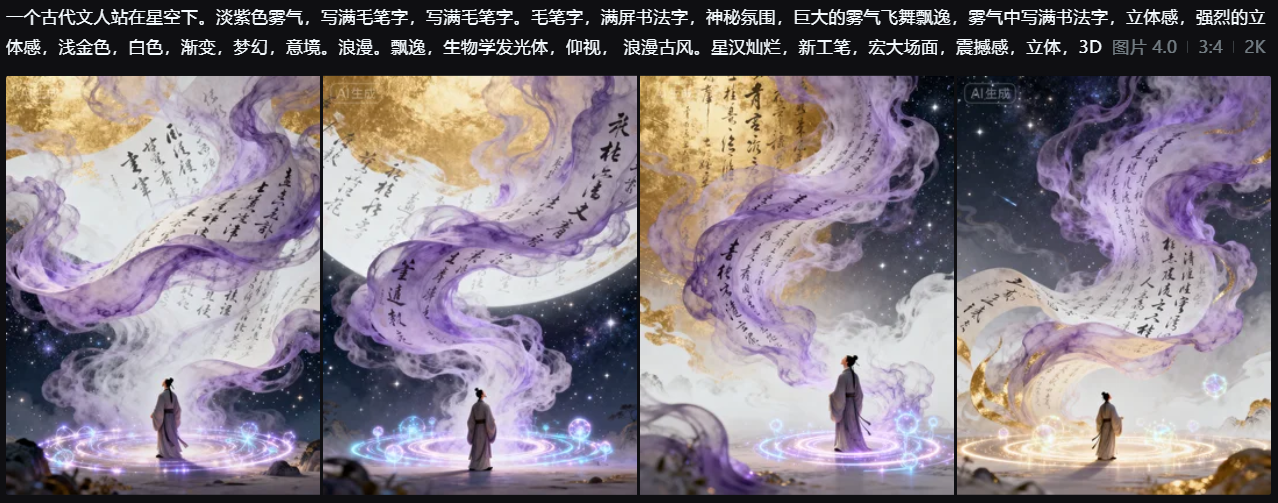 - 文生图/图生图:基于文本描述或参考图片生成高质量图像,支持多种尺寸和风格(如国风、厚涂、像素风),最高分辨率2K。