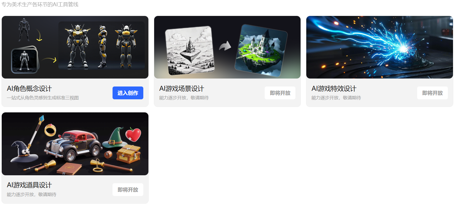 图像模型:包括游戏生图大模型底座、特效生成模型(覆盖17种特效类型和5大类风格,填补AIGC在游戏特效领域的空白)、透明图生成模型和角色原画生成模型。