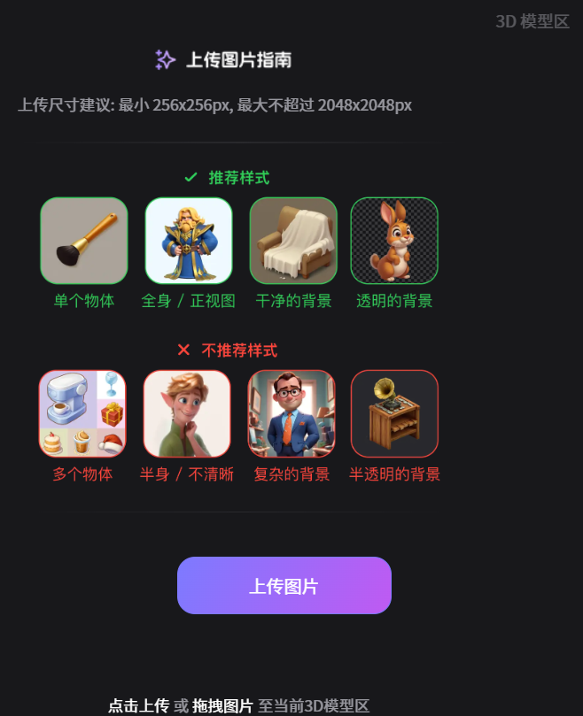 上传一张2D角色或物品图,可生成支持360°旋转查看的3D模型,并能自动生成多角度设定图,无需建模基础。