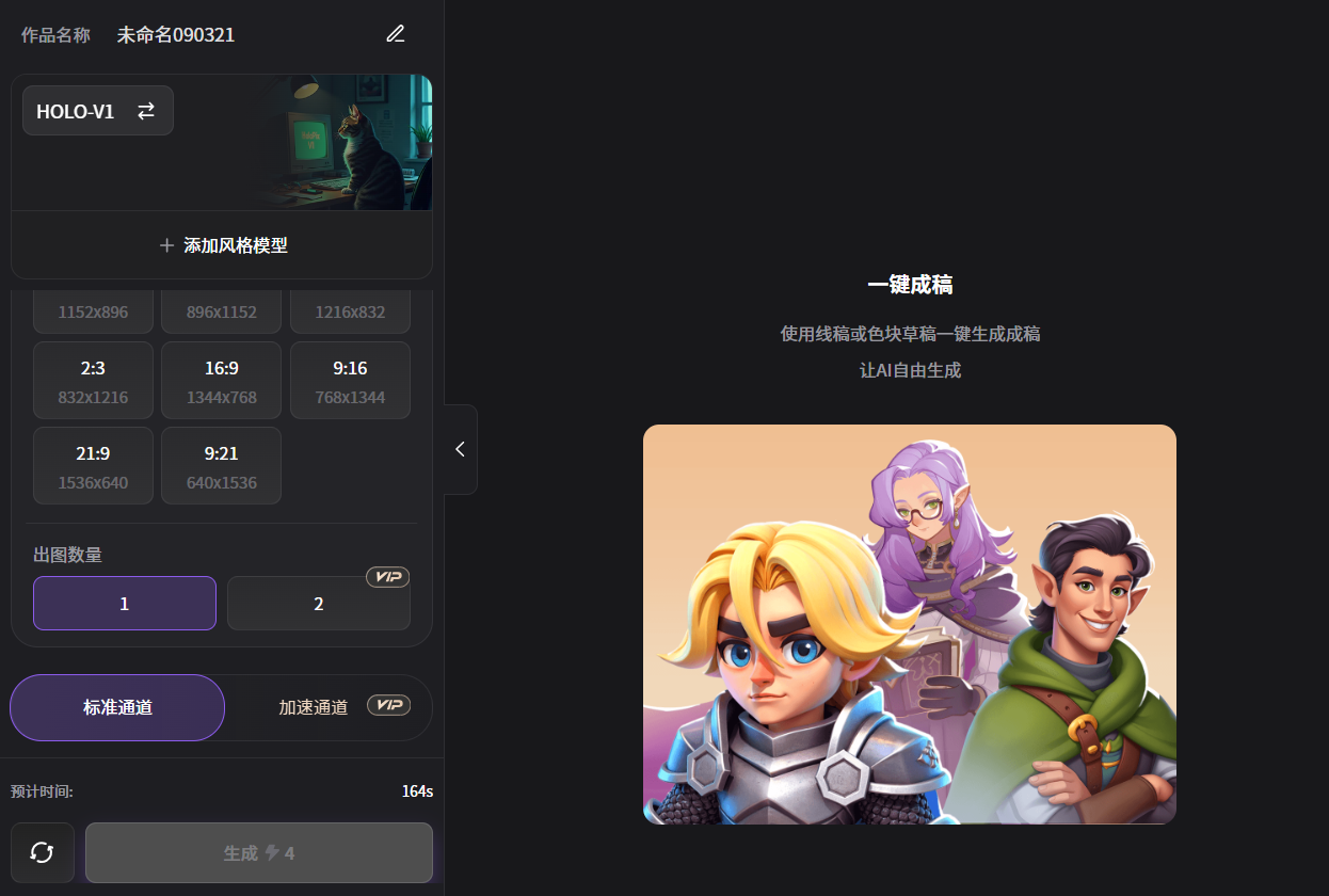 一键成稿:选择文生图、图生图或线稿生图等模式,输入描述词或上传图片,选择风格模型后生成。