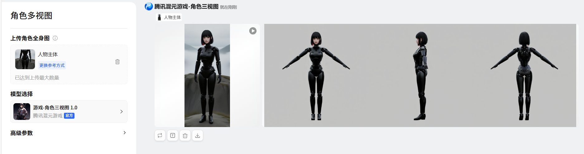 只需上传单张角色正面图,系统即可自动生成标准A/T Pose的正、侧、背三视图及360°旋转演示视频,角色一致性最高达99%,将传统12小时的耗时压缩至几分钟到30分钟。该能力已应用于头部游戏项目,助力美术团队效率提升300%。