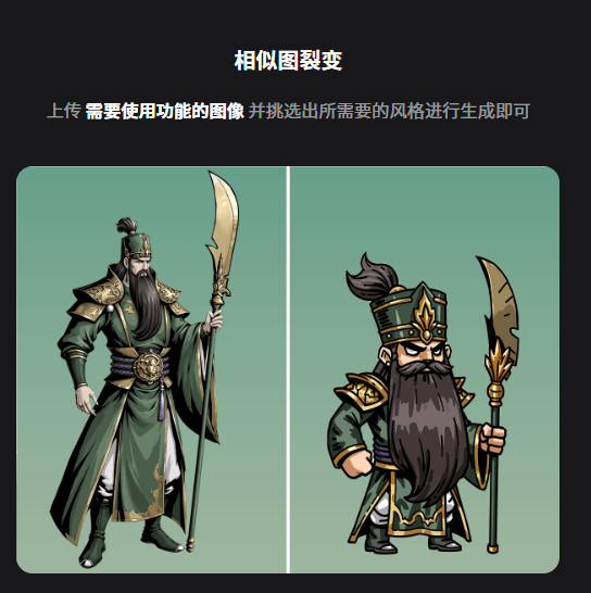 角色设计:从单张正面图生成多视角图乃至3D模型,并通过相似图裂变快速获得头像、Q版等不同形态的变体。