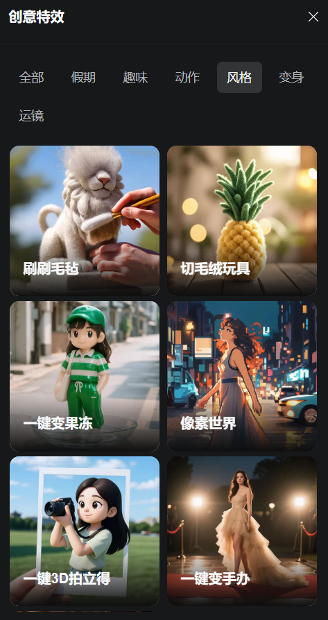 - 创意特效:提供"万物膨胀""捏捏乐"等趣味特效,实现物体变形或风格化转换。