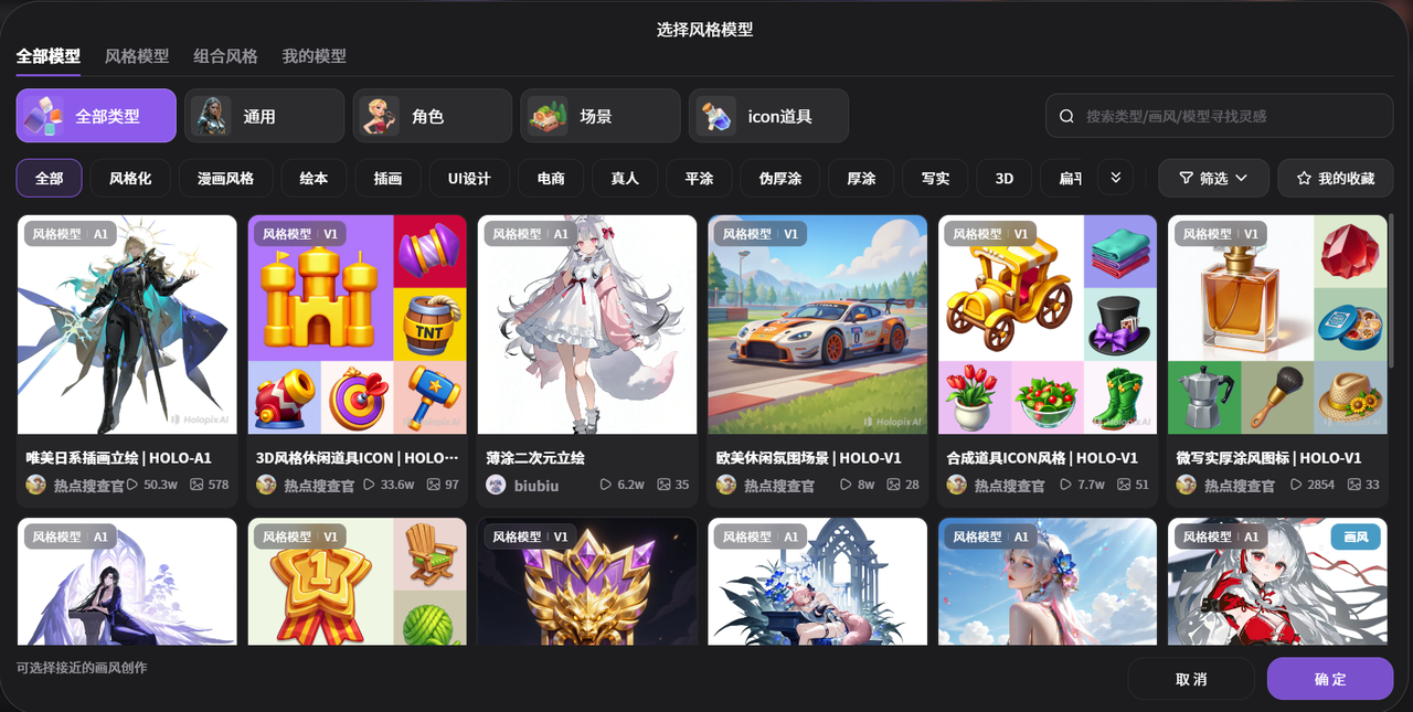 平台内置超过30种风格模型(如国风、欧美厚涂、像素风等),用户也可上传10张左右参考图训练专属风格模型,确保项目内所有素材的画风高度统一。