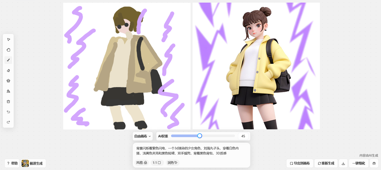 通过自研实时生成引擎,设计师在画布上绘制草图时,AI可同步渲染细节并即时反馈结果(响应时间约1秒),支持调整笔触、姿态、光影等参数,实现"边画边改"的沉浸式创作体验。此功能特别适合灵感发散和概念验证阶段,允许高频试错和快速定稿。