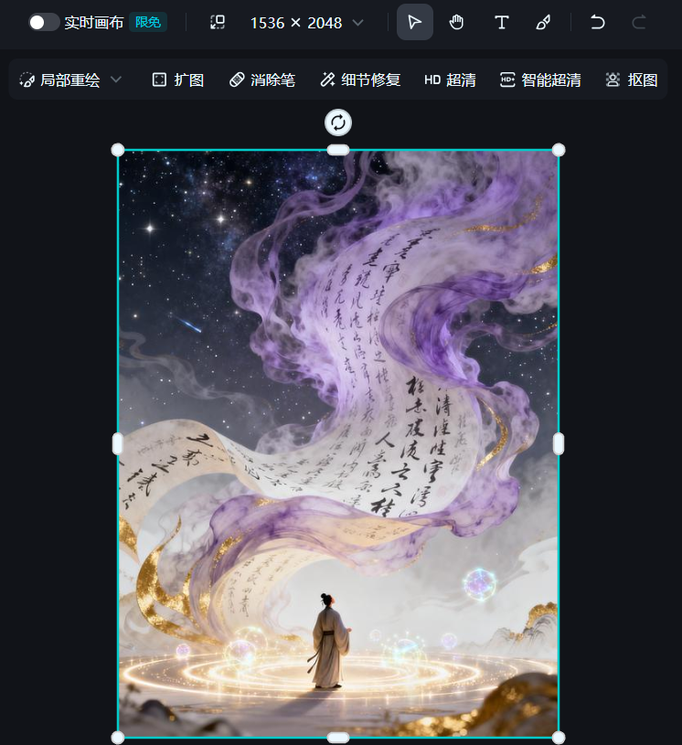 - **智能画布:**提供局部重绘、一键扩图、AI抠图、去水印等编辑工具,支持多图层融合,可精细化调整细节。
