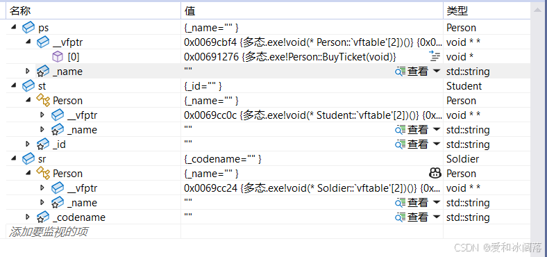 从底层的⻆度Func函数中ptr->BuyTicket(),是如何作为ptr指向Person对象调⽤Person::BuyTicket,ptr指向Student对象调⽤Student::BuyTicket的呢?通过下图我们可以看到,满⾜多态条件后,底层不再是编译时通过调⽤对象确定函数的地址,⽽是运⾏时到指向的对象的虚表中确定对应的虚函数的地址,这样就实现了指针或引⽤指向基类就调⽤基类的虚函数,指向派⽣类就调⽤派⽣类对应的虚函数。第⼀张图,ptr指向的Person对象,调⽤的是Person的虚函数;第⼆张图,ptr指向的Student对象,调⽤的是Student的虚函数。