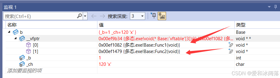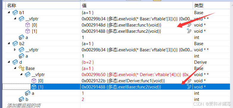 基类对象的虚函数表中存放基类所有虚函数的地址。同类型的对象共⽤同⼀张虚表,不同类型的对象各⾃有独⽴的虚表,所以基类和派⽣类有各⾃独⽴的虚表