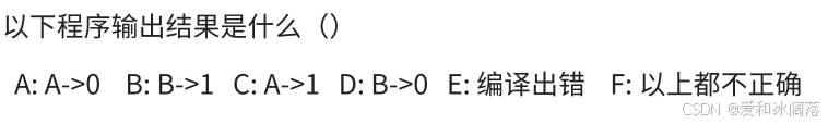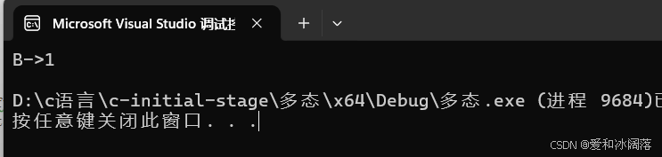 分析:首先A和B构成了继承,其次Func是虚函数,在类型B中构成了重写(函数名,返回值,参数列表相同,参数列表这里也是相同的,只看类型------int),p调用test函数走的时继承,那么就将p的指针传给了test中的this,那么是否是B*,显然有坑,那么为什么是A*?其次是test中调用Func是构成多态的,因为test传的是父类的指针A*,其次子类B进行了虚函数的重写,那么就构成了多态,即调用的是B的Func,那么答案是D吗,不不不,来看下打印结果