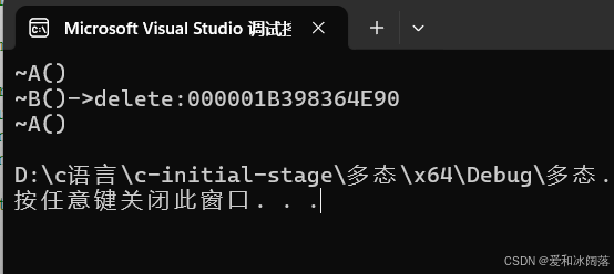 // 只有派⽣类B的析构函数重写了A的析构函数,下⾯的delete对象调⽤析构函数,才能