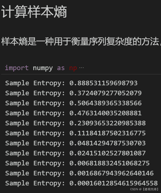 根据分解结果看,CEEMDAN一共分解出11个分量,然后通过计算每个分量的样本熵值进行分析。样本熵是一种用于衡量序列复杂度的方法,可以通过计算序列中的不确定性来评估其复杂性。样本熵越高,表示序列的复杂度越大。
