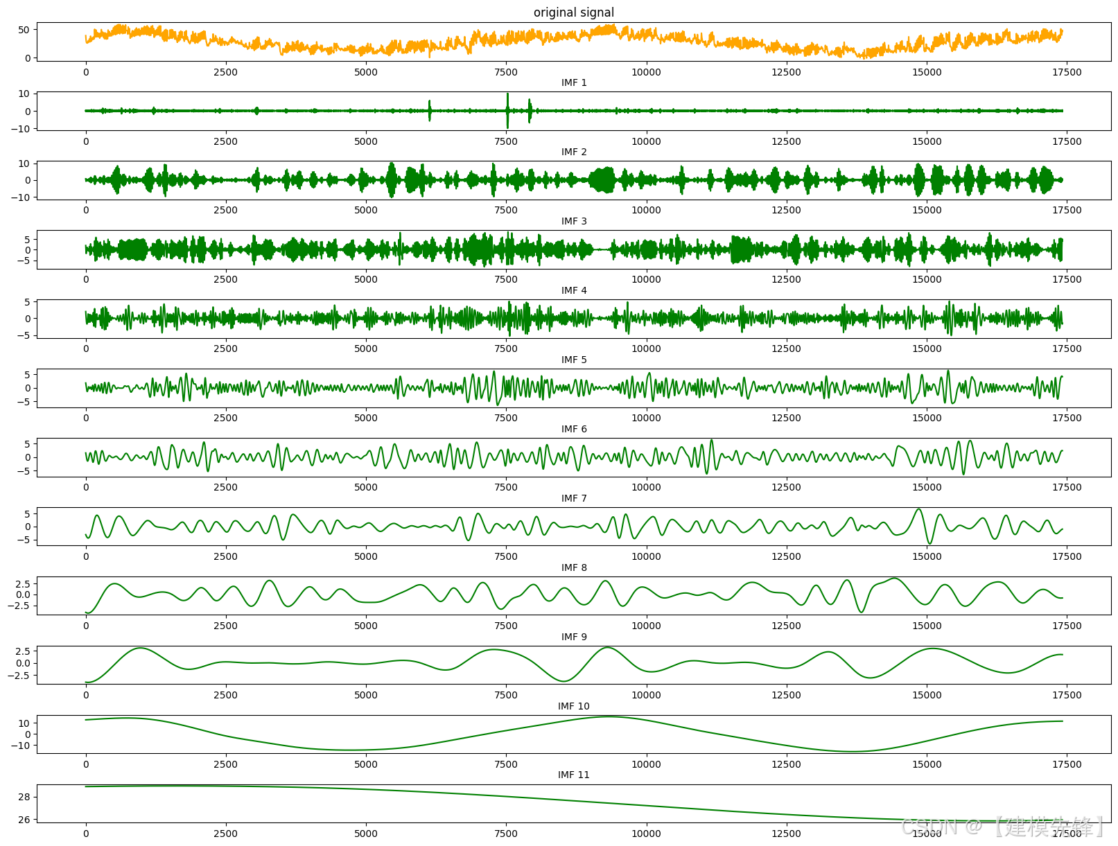 原始时间序列数据被输入到 CEEMDAN 算法中进行分解。CEEMDAN 是一种改进的集合经验模态分解方法,能够有效地将信号分解为若干固有模态函数(IMFs),这些 IMFs 各自代表不同频率的信号成分。