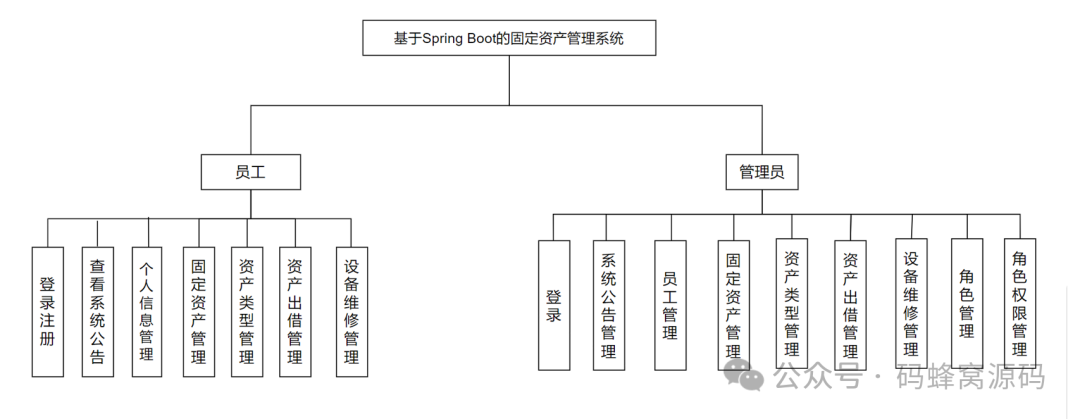 固定资产管理系统包括登录、系统公告管理、员工管理、固定资产管理、 资产类型管理、设备维修管理、 角色管理、 权限管理的功能模块设计如图 :