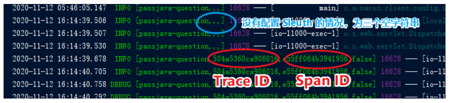 当没有配置 Sleuth 链路追踪的时候,INFO 信息里面是 [passjava-question,],后面跟着三个空字符串。当配置了 Sleuth 链路追踪的时候,追踪到的信息是 [passjava-question,504a5360ca906016,e55ff064b3941956,false] ,第一个是 Trace ID,第二个是 Span ID。**只有日志没有图,观看不方便,不美观,so,**引入图形化Zipkin链路监控让你好看,O(∩_∩)O。