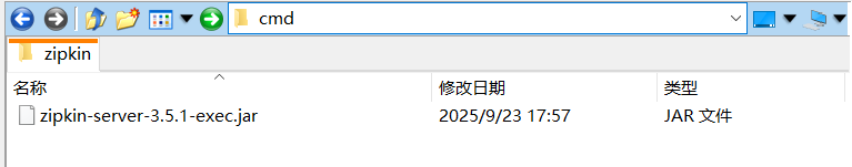 然后找到包含 zipkin-server-3.5.1-exec.jar文件的目录,在目录搜索框内输入 cmd 并回车。