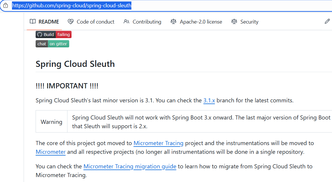 Micrometer Tracing 是新一代的 Sleuth,该组件只支持3.x版本以上的 Spring Boot 框架。老版本的 Sleuth 仍然支持2.x版本的 SprintBoot 版本的框架。具体信息可参考官方网址https://docs.spring.io/spring-cloud-sleuth/docs/current/reference/html/、https://spring.io/projects/spring-cloud-sleuth#overview、https://micrometer.io/docs/tracing、https://github.com/spring-cloud/spring-cloud-sleuth。
