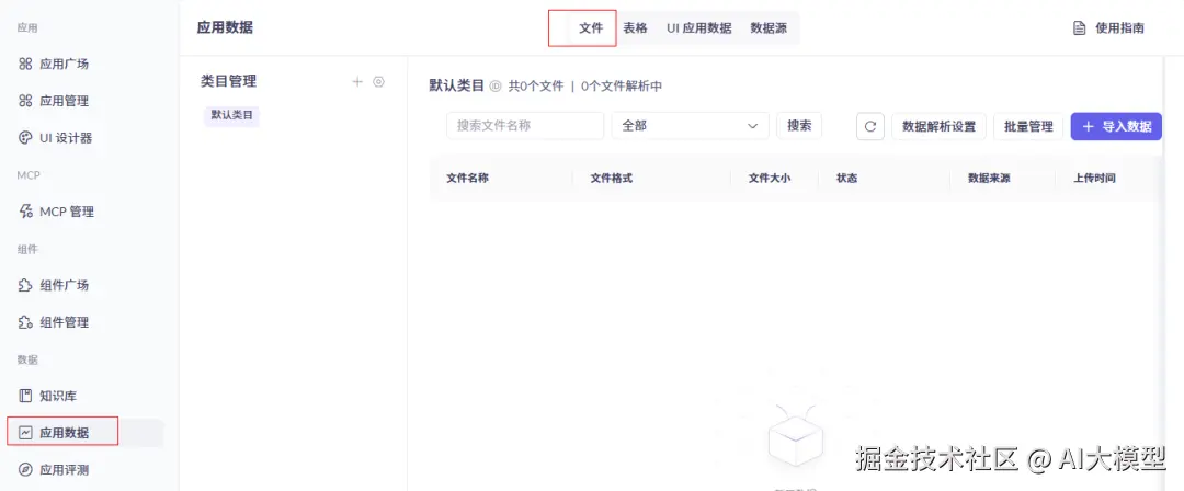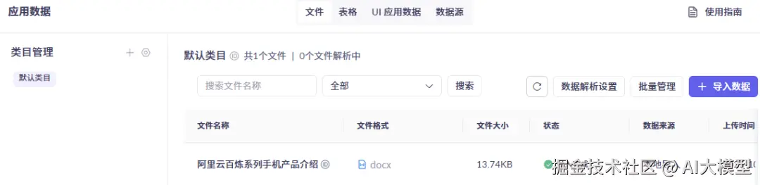 应用数据将作为知识库的数据来源。所以先添加一些数据源。