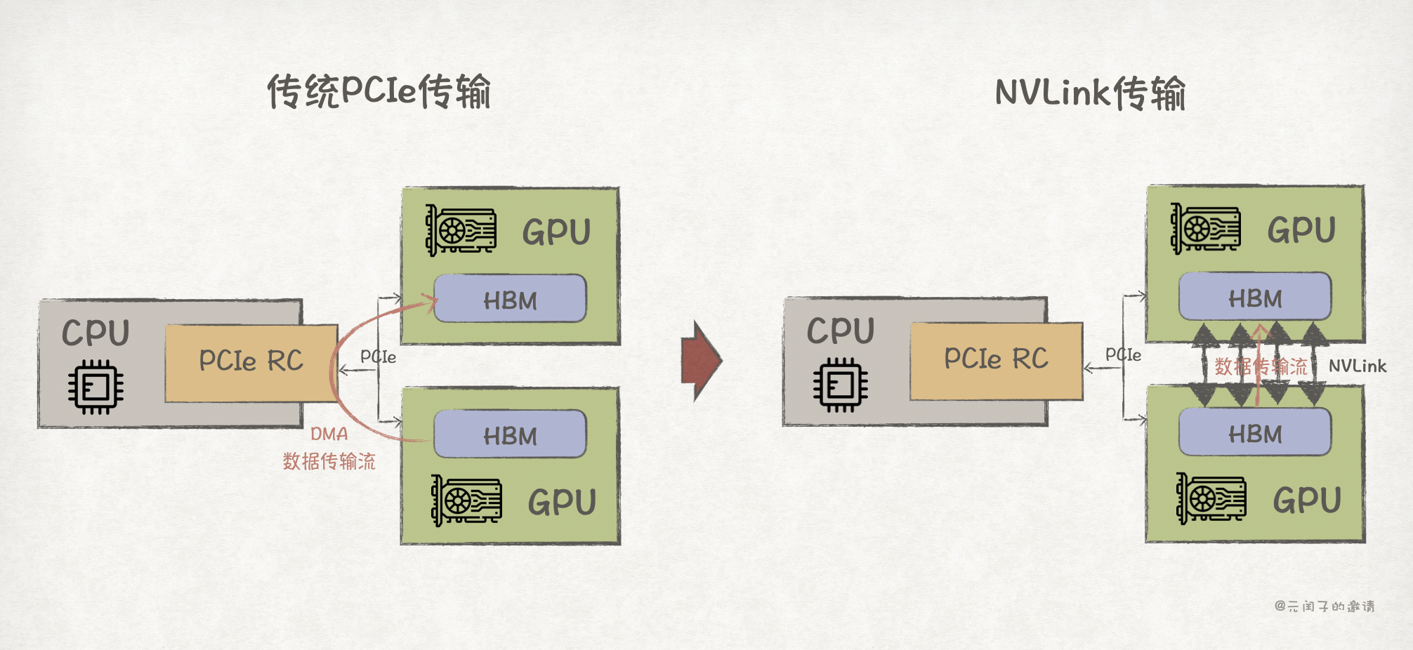 AI 应用程序通常会跑在 GPU 上,GPU 通过 PCIe 接口接入 CPU。当程序需要跨 GPU 通信时,最开始的方案是基于 PCIe 的 DMA 完成数据传输。