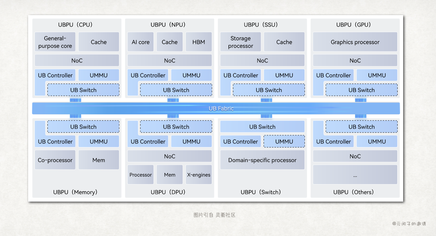 华为给出了他们的答案,在今年 9 月份开放了灵衢 UB 2.0 协议。UB(Unified Bus)是一个面向超节点的互联协议: