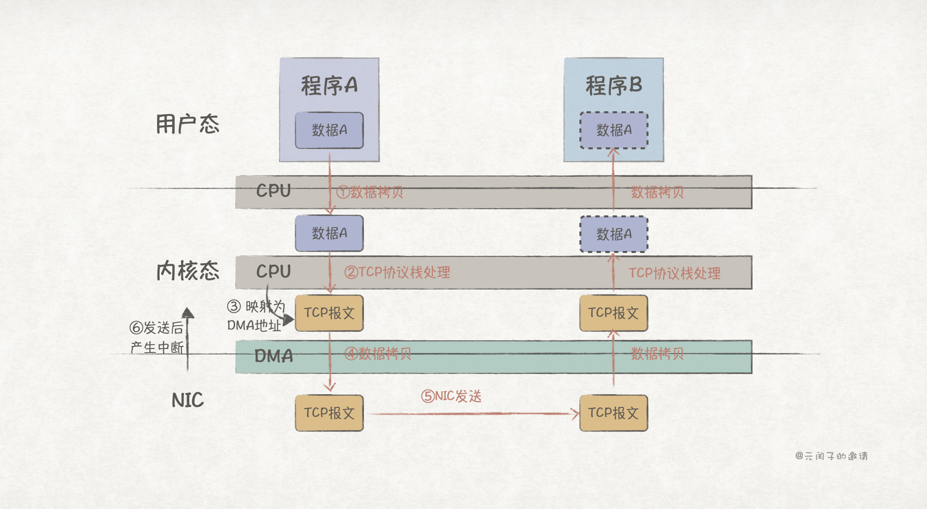 NIC 发送数据后,再通过硬件中断唤醒 CPU 继续处理程序 A 接下来的逻辑。接收方也是类似的流程。