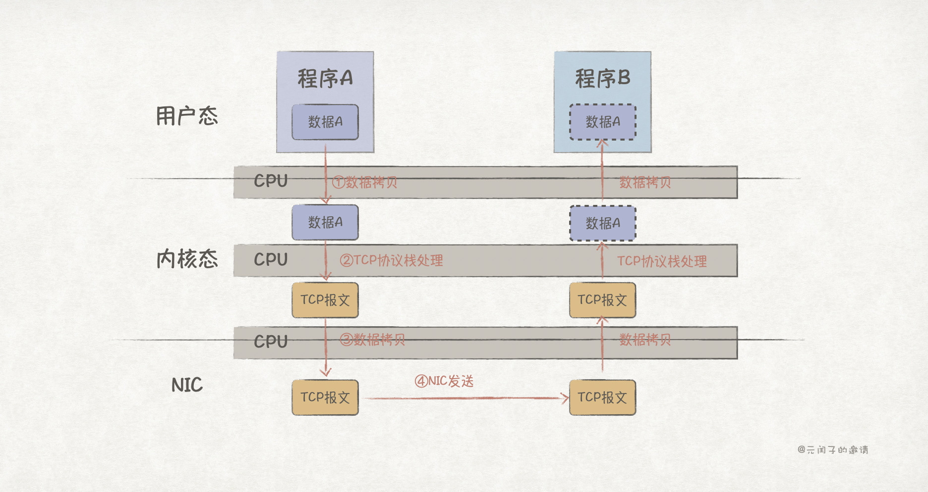 然而,每次发送数据都要经历一次从用户态到内核态的数据拷贝,这其中涉及到了 1 次 CPU 上下文切换;而每次发送后产生中断,都需要 CPU 进行上下文切换,并处理中断程序。