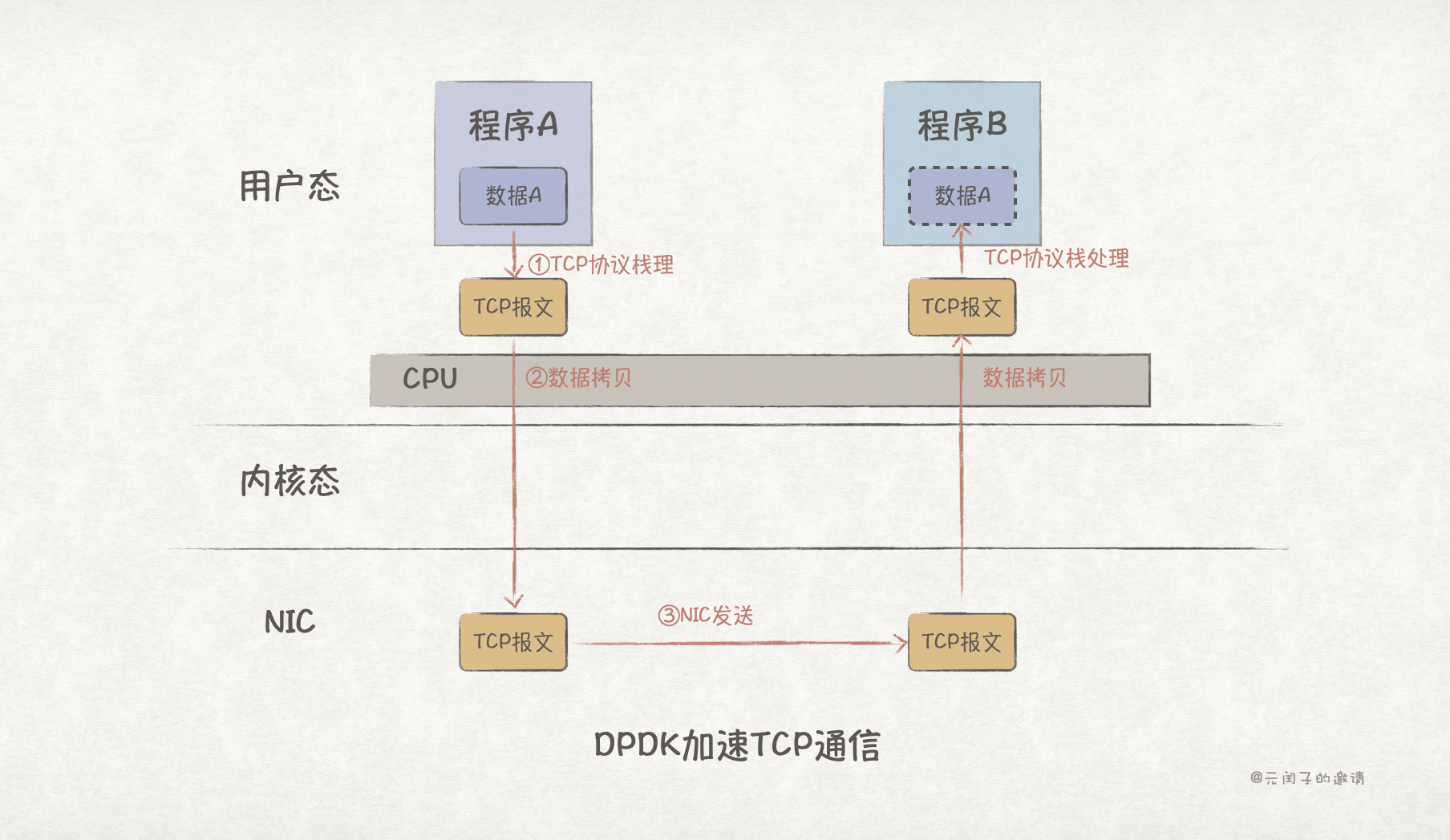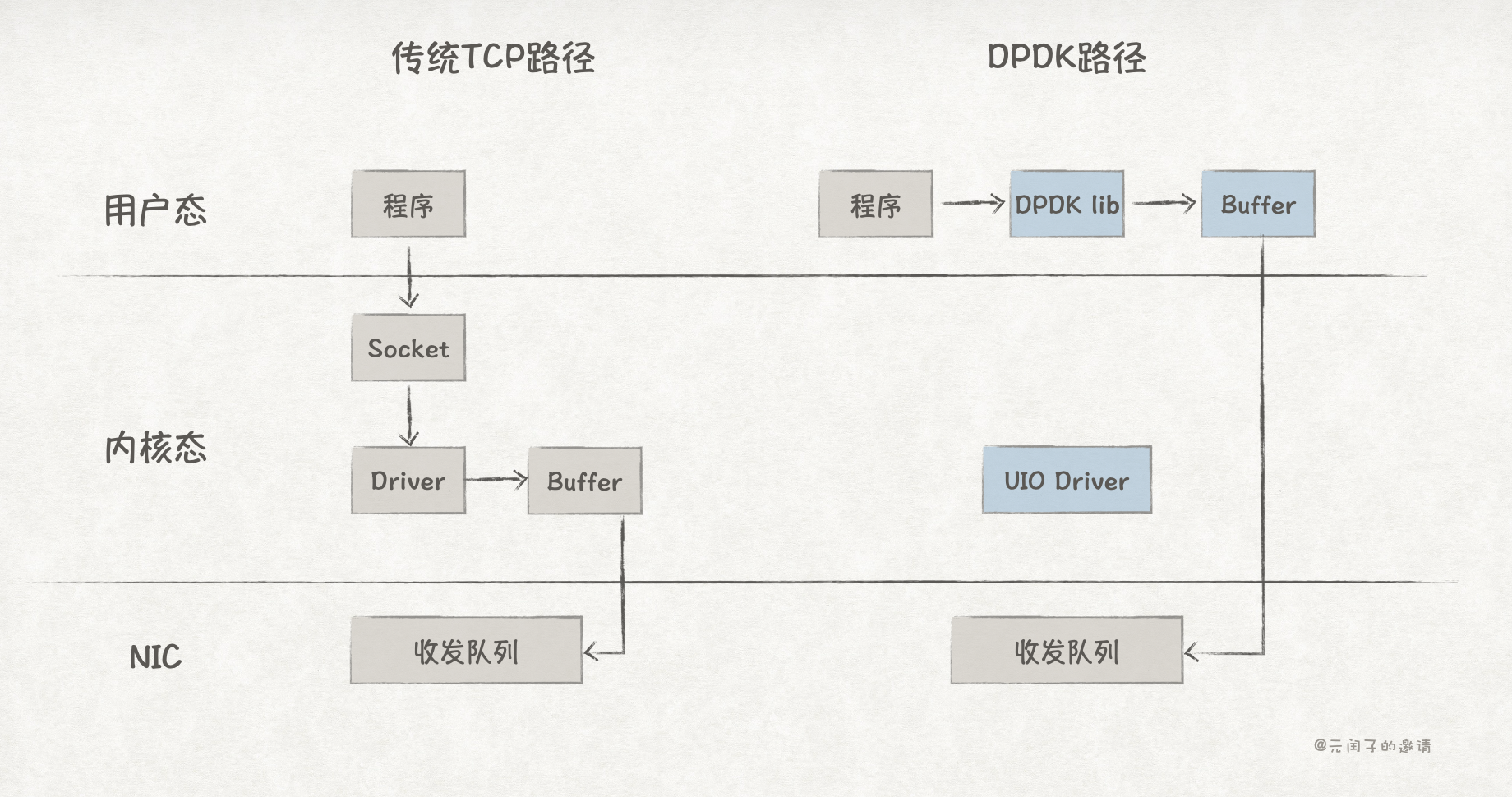DPDK(Data Plane Development Kit)是由 Intel 推出的一个网络加速库,与传统 TCP 通信路径对比如下: