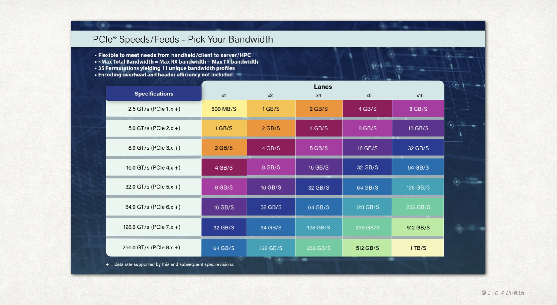 CXL 基于 PCIe 实现,这意味着 CXL 的性能受限与 PCIe 的性能,如下为各个版本 PCIe 协议的带宽规格: