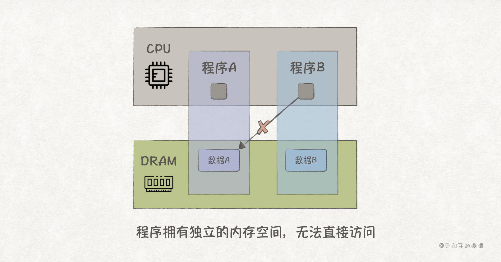 在《探索OS的内存管理原理》里我们提到,每个程序都有独立的内存地址空间,以防止其他程序的篡改。所以,程序 A 保存在内存里的业务数据,程序 B 是无法访问的。