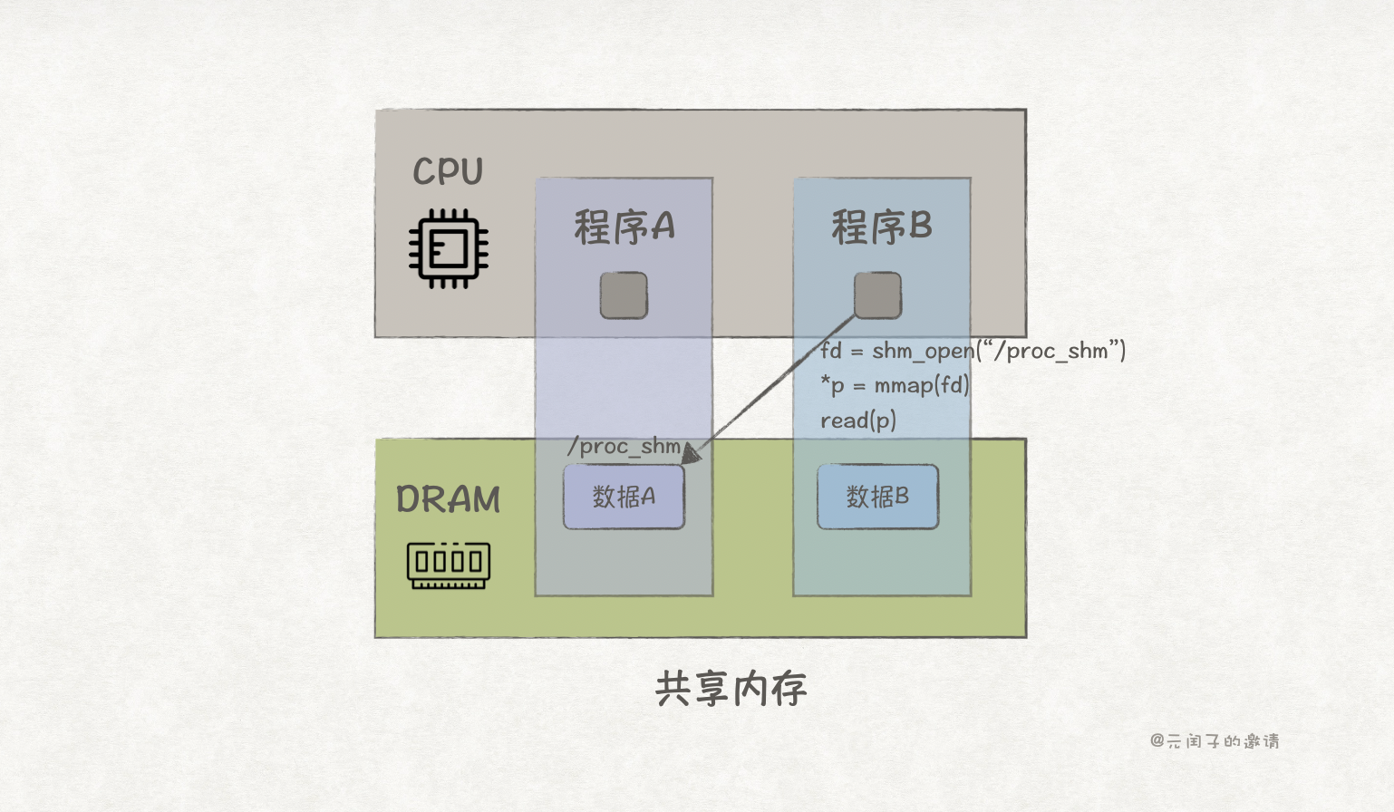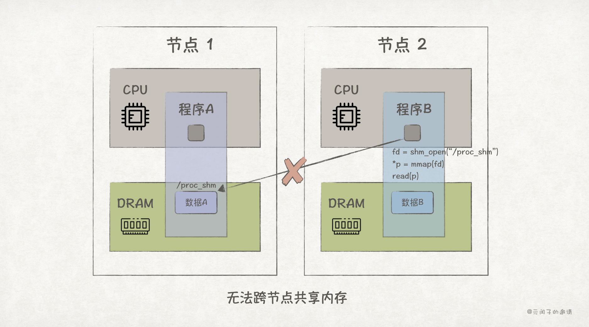 然而,使用共享内存的前提是程序们必须处在同一个物理内存下。如果程序 A 和程序 B 分布在不同的节点,那么共享内存就无法用了,需要网络通信。