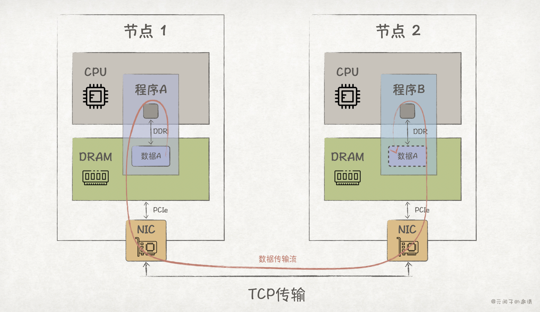 TCP 网络通信的带宽与网卡规格相关,比如常见的 100Gb 网卡,双边通信带宽 25GB/s。但在通信时延上,不算网络传播时延,数据从用户态到 NIC 发出的过程,就需要 >100µs。