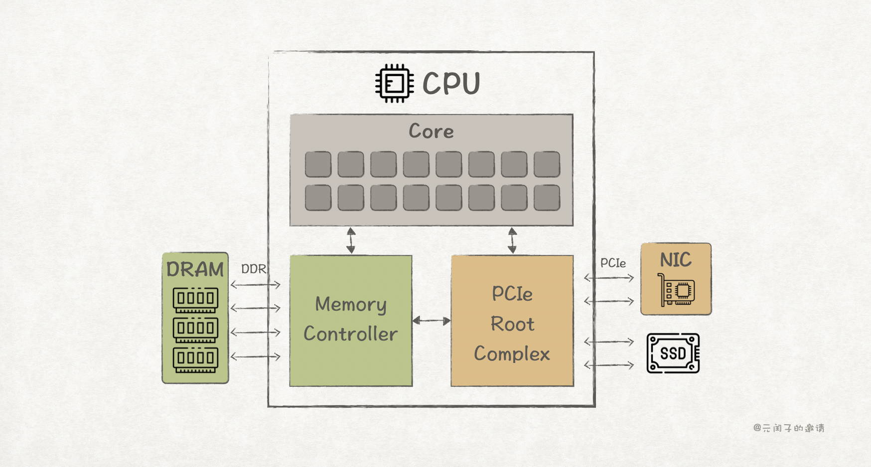 而网卡 NIC、SSD 等高速外围设备则通过 PCIe 接口接入 CPU,由 PCIe Root Complex 进行协议解析、路由等。