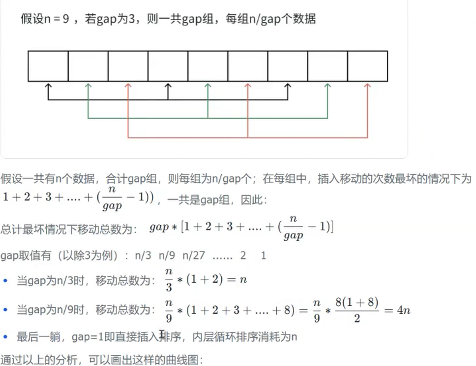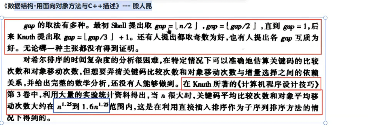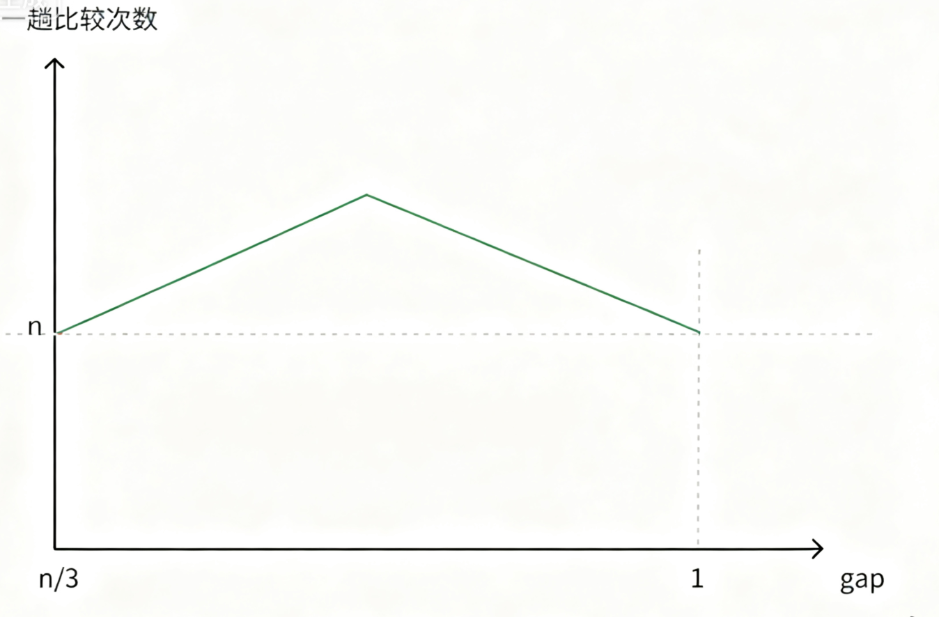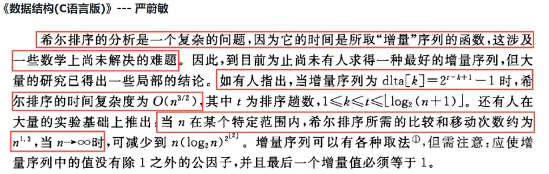 因此,希尔排序在最初和最后的排序次数都为 n(n 为数组长度):前一阶段排序次数呈逐渐上升的状态,当到达某一顶点后,排序次数会逐渐下降至 n,而该顶点的具体计算过程暂时无法给出。希尔排序的时间复杂度难以精确计算,核心原因是 间隔(gap)的取值方式多样(如 "减半法""Knuth 序列" 等),不同 gap 序列对排序次数的影响差异较大,导致时间复杂度没有固定统一的计算结果。在严蔚敏所著的《数据结构(C 语言版)》中,给出的希尔排序时间复杂度范围为 (O(n^{1.3}) \sim O(n^2))(注:书中未指定单一固定值,而是基于常见 gap 序列的复杂度区间)。