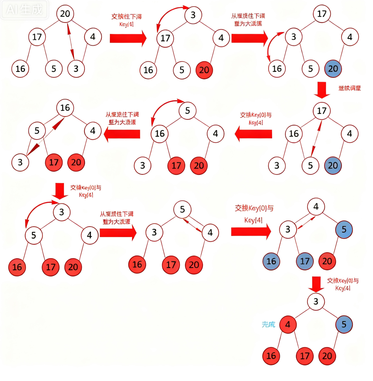 堆排序(Heapsort)是指利用堆积树(堆)这种数据结构所设计的一种排序算法,它是选择排序的一种。它是通过堆来进行选择数据。需要注意的是排升序要建大堆,排降序建小堆。