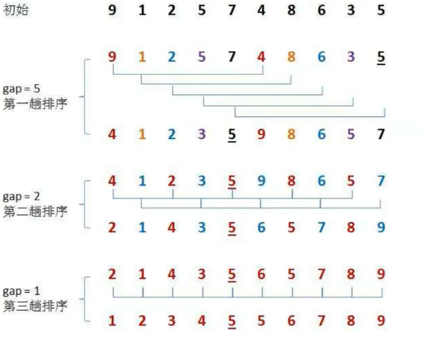 希尔排序法又称缩小增量法。希尔排序法的基本思想是:**先选定一个整数,把待排序文件中所有记录分成多个组, 所有距离为的记录分在同一组内,并对每一组内的记录进行排序。然后,去重复上述分组和排序的工作。**当到达gap =1时,所有记录在统一组内排好序。