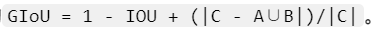 GIoU(Generalized IOU) :引入 "能同时包含预测框(A)和真实框(B)的最小封闭框 C",公式为。既解决了 "无交集时梯度为 0" 的问题,又能通过封闭框 C 反映位置差异,引导预测框向真实框靠近。