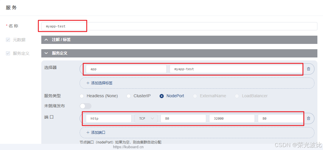 (与Deployment名称保持一致,便于识别); - 【选择器】:点击【添加标签选择器】,设置"键"为