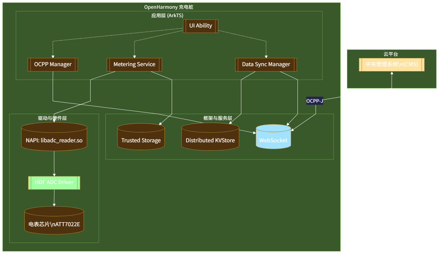 - 应用层:使用 ArkTS 编写业务逻辑,包括 OCPP 状态机、计量服务、数据同步服务和用户界面。