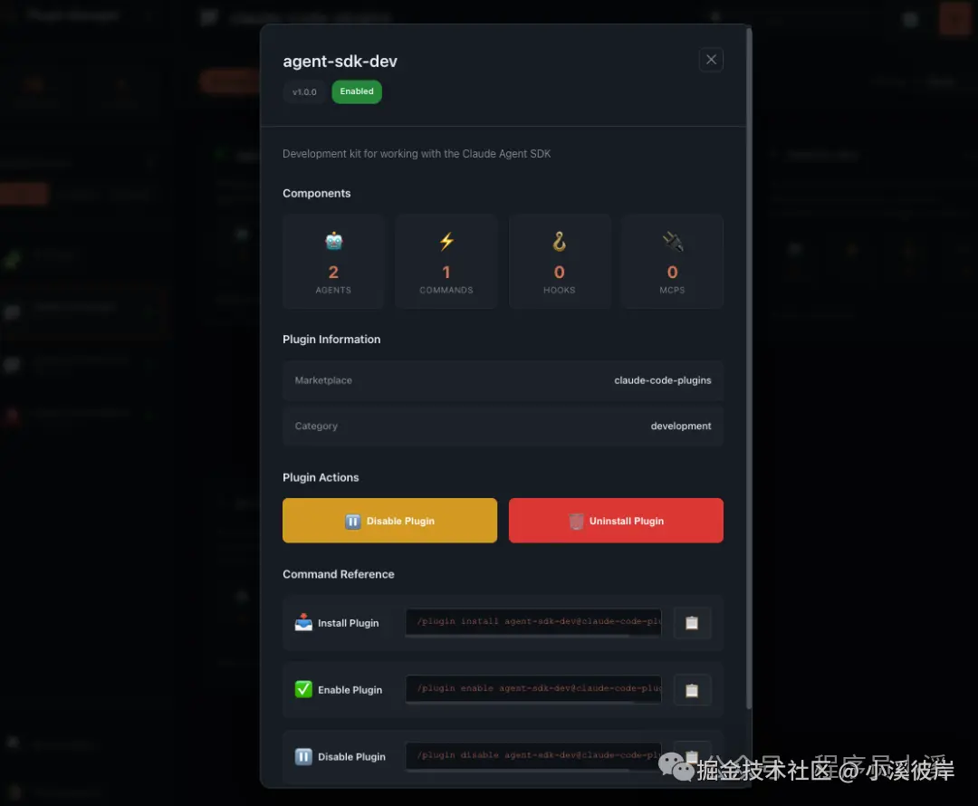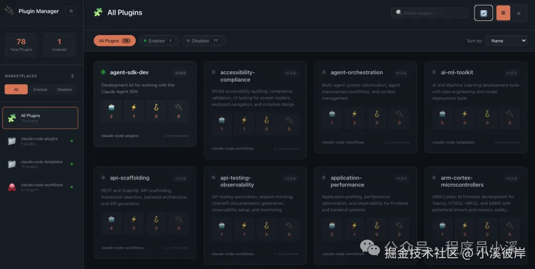 插件仪表板罗列了已安装的所有插件市场和插件,在这里可以直观的查看插件市场和插件的状态,进入插件详情可以查看插件的详细信息,甚至提供了所有插件的操作指令