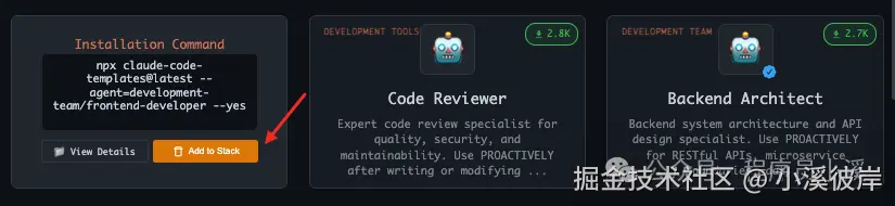 Claude Code Templates提供一键安装多个模版功能,点击任意模版项目,点击【Add to Stack】