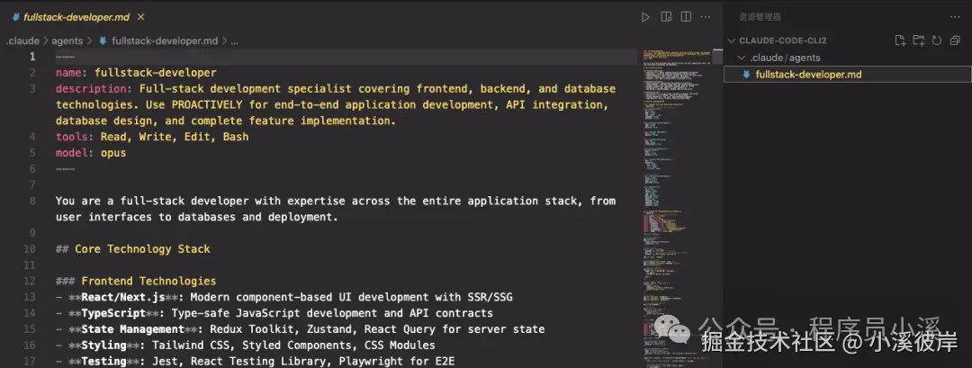 回到项目可以发现此时 ./claude/agents/ 目录会多一个 fullstack-developer.md 文件