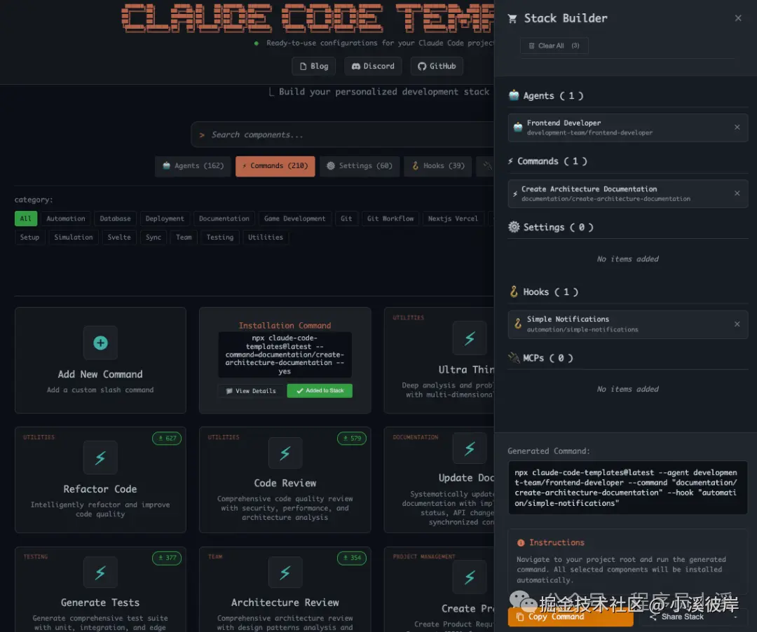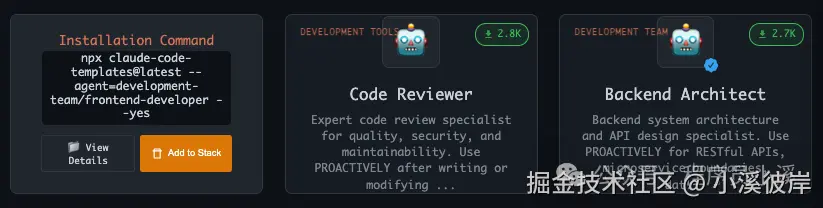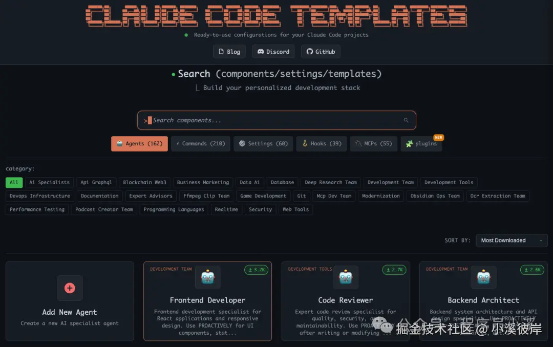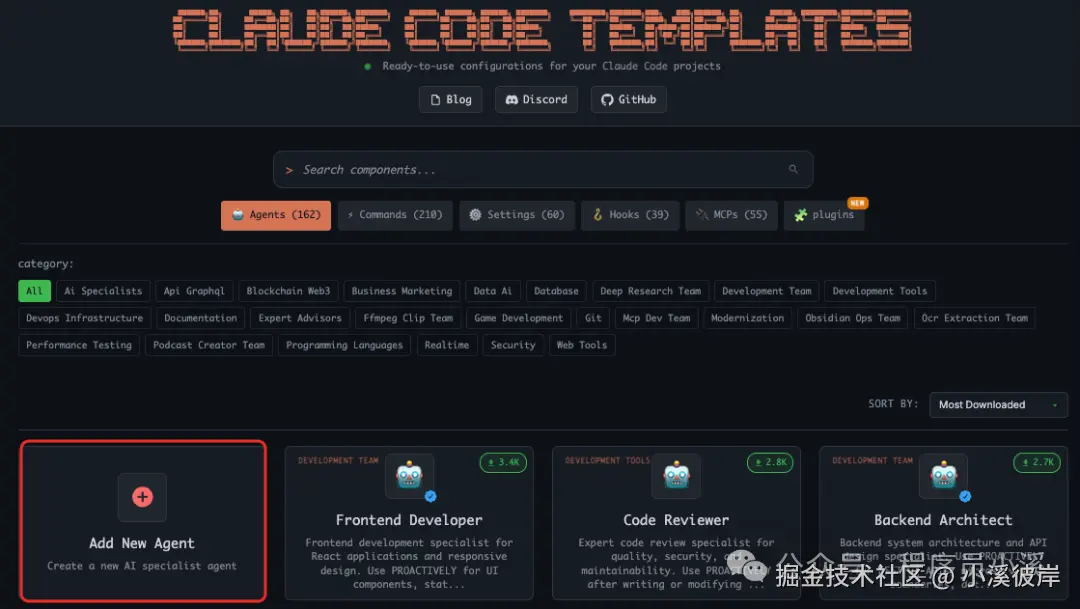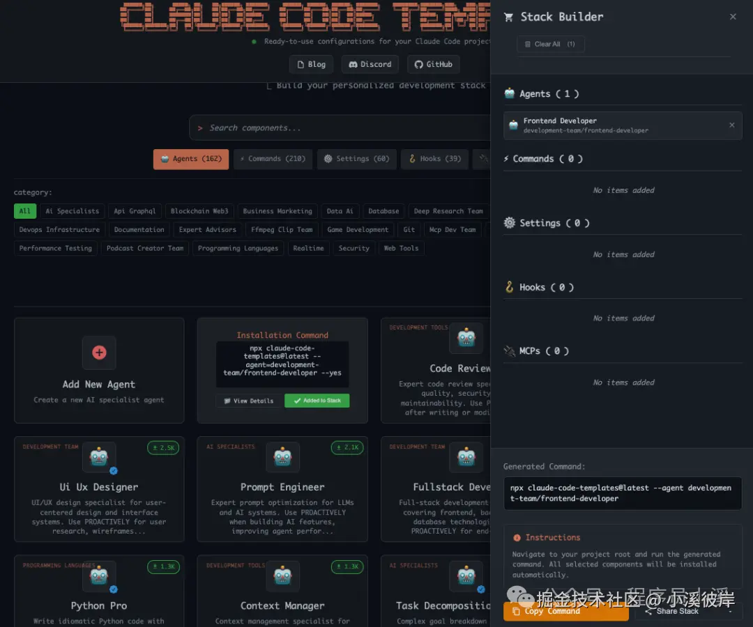 如果不习惯使用命令行工具,Claude Code Templates还提供了可视化配置方式,可以直接通过官网查看:www.aitmpl.com/agents