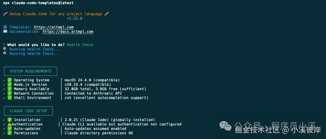 Claude Code Templates面板选择【Health Check】或者输入以下命令:、