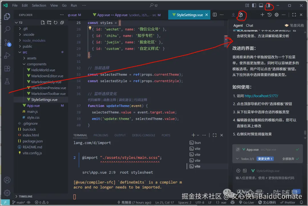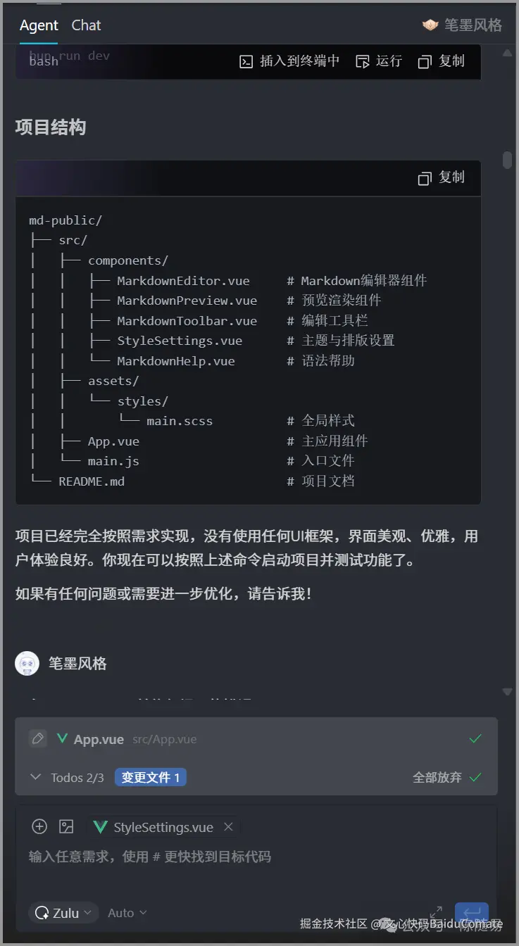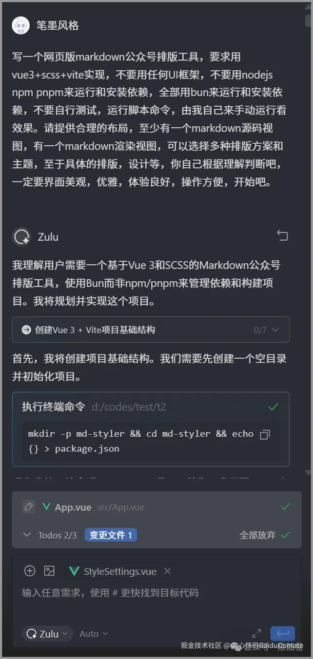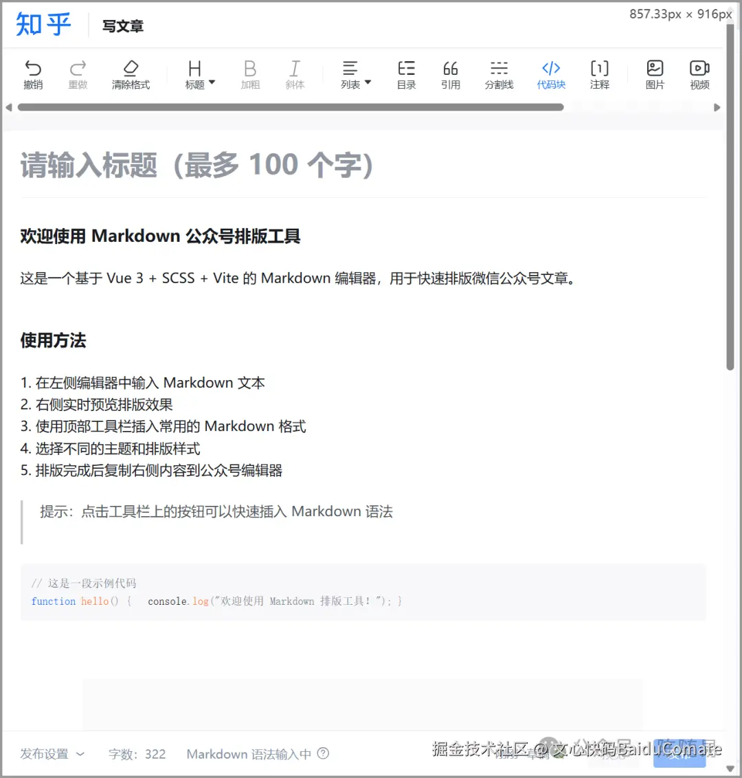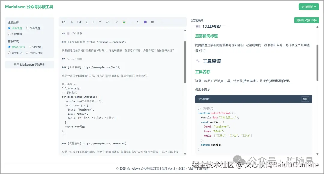 说了这么多,我们来看看实操效果。我做技术自媒体快2年了,接触和认识了很多技术博主,有一个问题隔一段时间就会有人问我,Markdown 文件排版美化怎么做?我发出去的文章,排版太丑了。 那正好,咱们就用 文心快码 来写一个 Markdown 排版工具。
