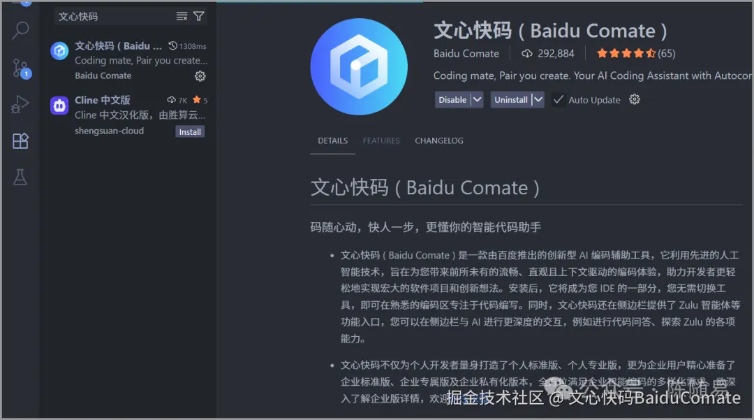 安装方式很简单,在 VSCode 扩展里搜索 文心快码 即可。文心快码 还支持 JetBrains、Visual Studio、Xcode、Eclipse 等,在对应的编辑器中搜索 Baidu Comate 即可。